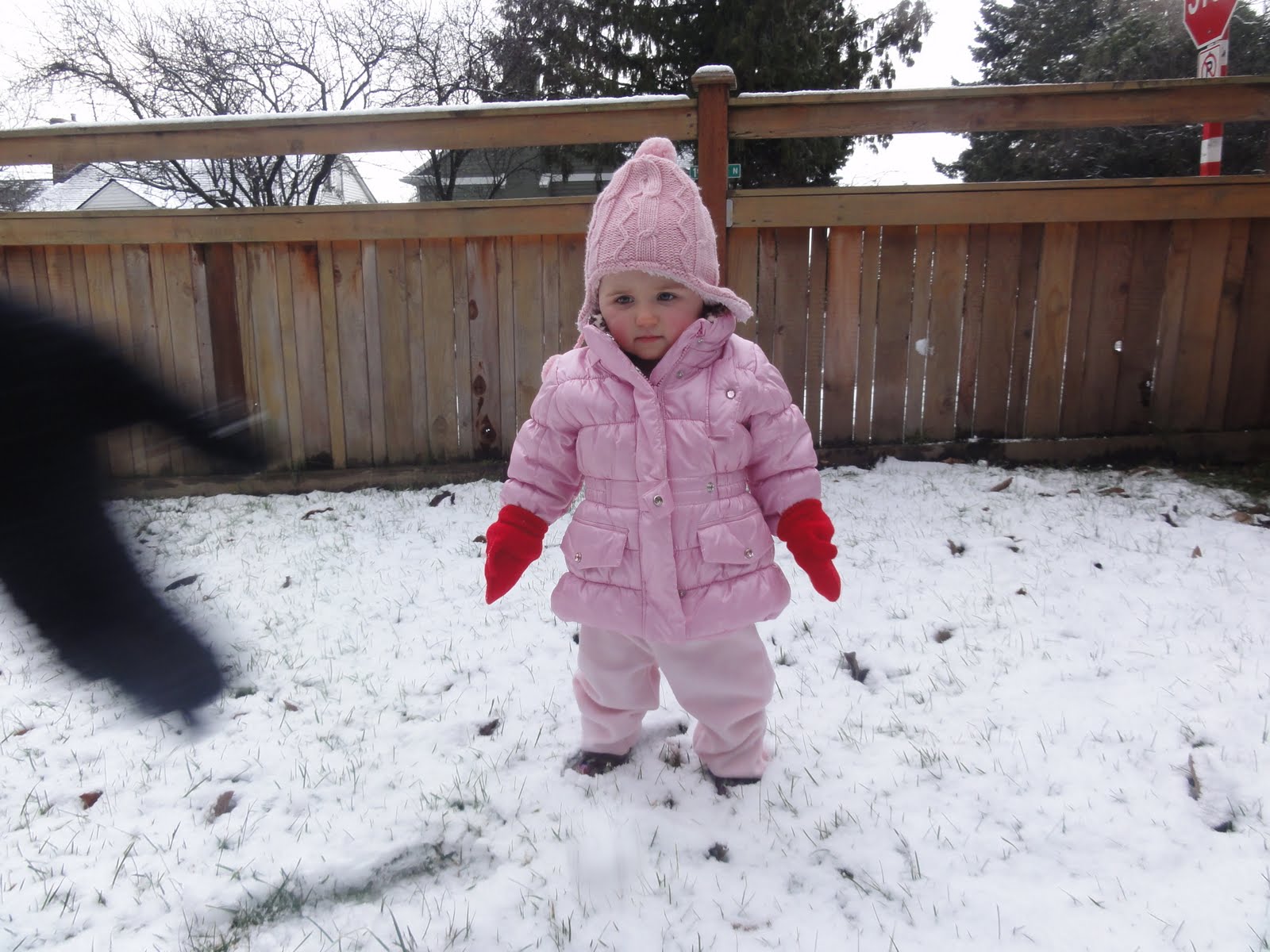 It snowed! Parker has been sick with the stomach flu for a week but she insisted on going outside and checking out this white stuff. So what did we do? We bundled the girl up and let her loose. She was quite nervous to walk on snow but really enjoyed catching it with her hands.